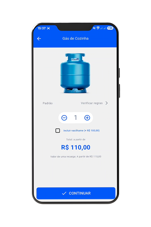 Resgate o cupom em “Meus Cupons”, depois acesse “Produtos”, selecione “Comprar Gás” e clique em “Continuar”.