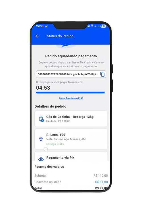 No tipo de pagamento, selecione “Pagar Online no App”. Escolha a forma de pagamento, aplique o cupom e finalize a compra. Depois, é só receber o botijão em casa.